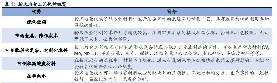 粉末冶金是一種綠色、低能耗、高材料利用率的技術(shù),符合高質(zhì)量發(fā)展趨勢粉末冶金工藝優(yōu)勢突出,為可持續(xù)發(fā)展帶來巨大空間。相比鑄造、鍛造等其他冶金工藝,粉末冶金是最先進的金屬成形工藝,也是最綠色低碳的工藝。與傳統(tǒng)冶金工藝相比,粉末冶金材料利用率最高(95%以上,傳統(tǒng)機加工只有 50%)、能耗最低,根據(jù) EPMA,用于制造粉末冶金部件的原材料中約 80%來自回收廢料,在某些情況下,將鑄造或鍛造部件轉(zhuǎn)換為粉末冶金可節(jié)省 40%或更高的成本。除此之外,利用粉末冶金還可加工形狀復(fù)雜的零件,生產(chǎn)難熔的金屬以及化合物等。當使用粉末冶金技術(shù)對統(tǒng)一形狀數(shù)量眾多的產(chǎn)品進行生產(chǎn)時,例如齒輪等費用較高的產(chǎn)品,可以極大降低生產(chǎn)成本,提高生產(chǎn)效率。粉末冶金