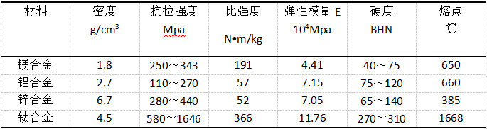 對(duì)于消費(fèi)類(lèi)產(chǎn)品而言,常用的合金材料有鋁合金、鋅合金和鎂合金。鈦合金由于其生物相融性好,常用在醫(yī)療領(lǐng)域。歸納性的總結(jié)先放在前面,見(jiàn)以下性能表。